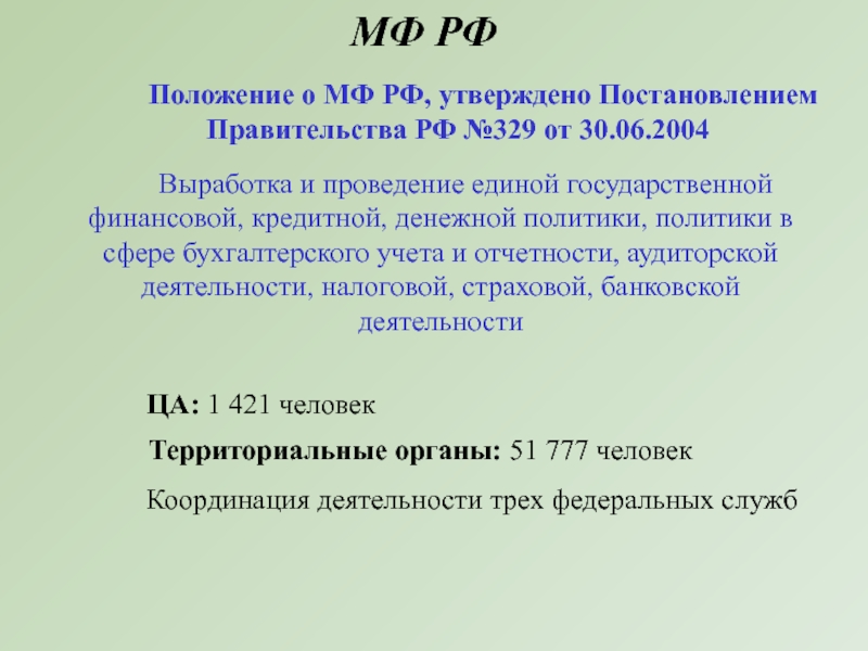 Положение о МФ РФ, утверждено Постановлением Правительства РФ №329 от 30.06.2004