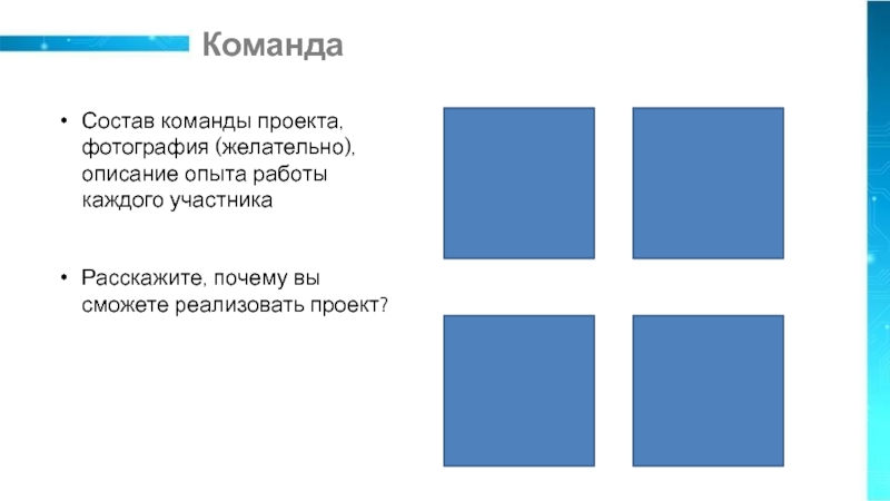 КомандаСостав команды проекта, фотография (желательно), описание опыта работы каждого участника Расскажите, почему вы сможете реализовать проект?
