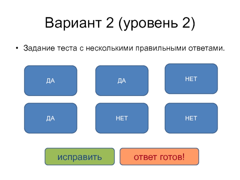тест» (можно удалить кнопки 3 уровней, если они не нужны); б) заголовок, все блоки текста и кнопку на 2 слайде («ещё»); в) сами 1-й и 2-й слайды (а также вставлять слайды между ними); г) в варианте с несколькими правильными ответами (слайд 4) нельзя удалять кнопку «ответ готов!». Кнопку «исправить» удалять можно (будет невозможен повтор в решении задания).Задания тренажера начинаются с 3-го(!) слайда. Также рекомендуется сразу добавить к шаблону необходимое количество слайдов и придерживаться его (т.к. при беспорядочном удалении и вставке слайдов может нарушиться их нумерация, что важно для правильной работы тренажера)