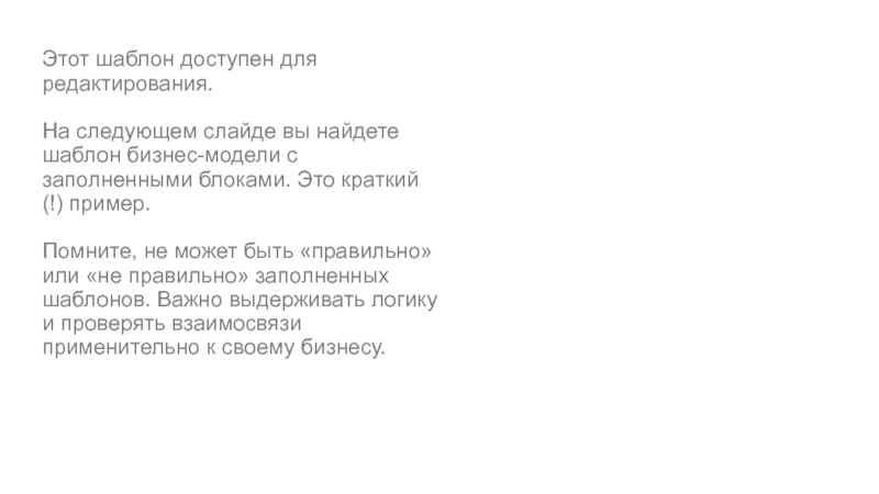 Этот шаблон доступен для редактирования. На следующем слайде вы найдете шаблон бизнес-модели с заполненными блоками. Это краткий(!) пример. Помните, не может быть «правильно» или «не правильно» заполненных шаблонов.
