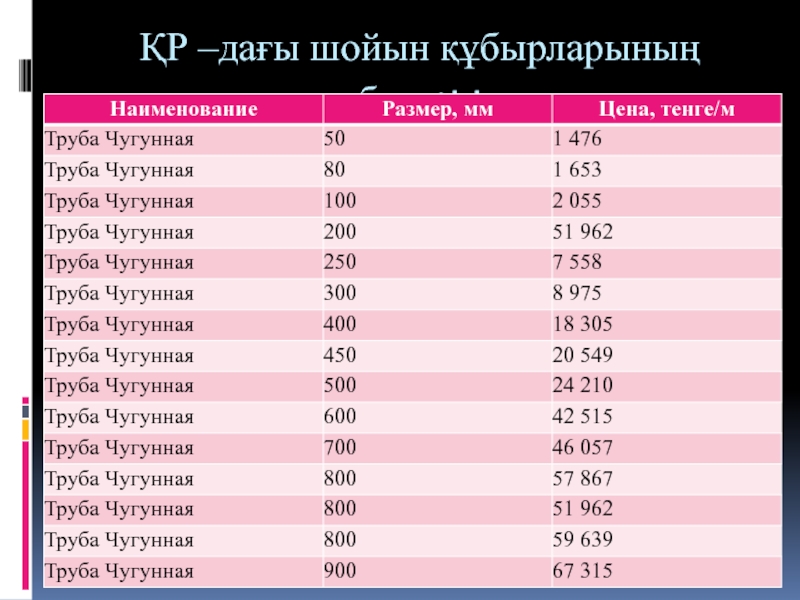 Слайд 27ҚР –дағы шойын құбырларының бағасы
