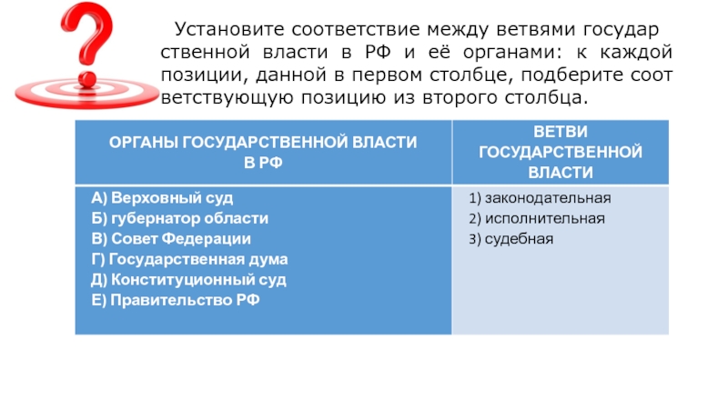 Слайд 28Установите соответствие между ветвями государственной власти в РФ и её