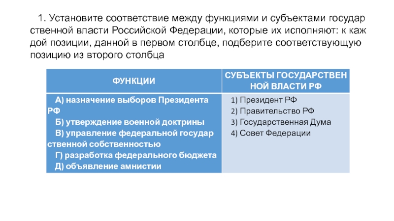 Слайд 541. Установите соответствие между функциями и субъектами государственной власти Российской