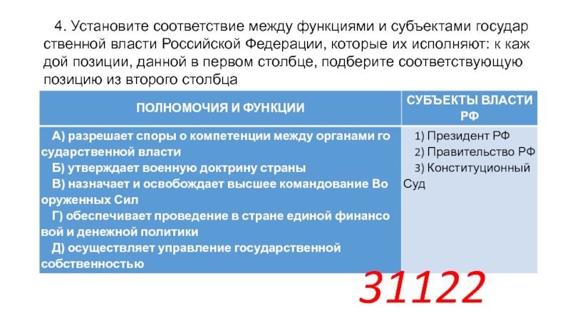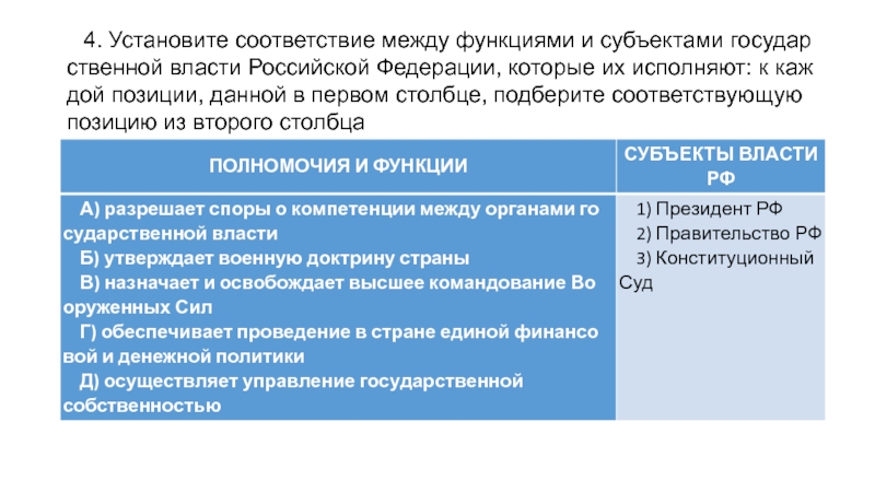 Слайд 604. Установите соответствие между функциями и субъектами государственной власти Российской