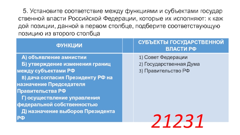 Слайд 615. Установите соответствие между функциями и субъектами государственной власти Российской