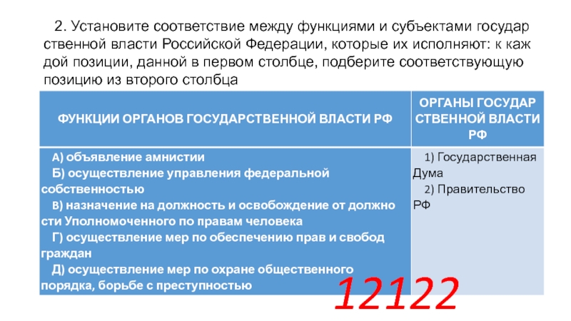 Слайд 562. Установите соответствие между функциями и субъектами государственной власти Российской