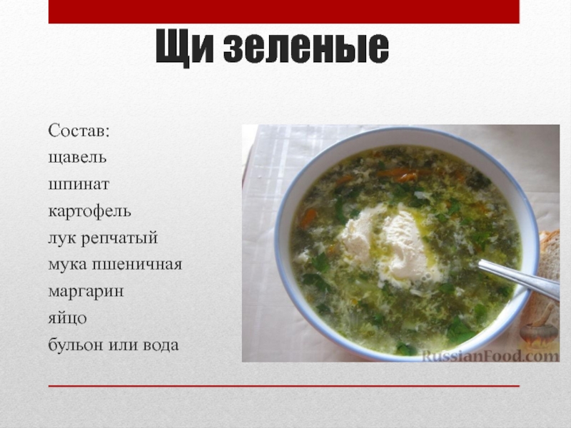 Щи зеленыеСостав:щавельшпинаткартофельлук репчатыймука пшеничнаямаргариняйцобульон или вода