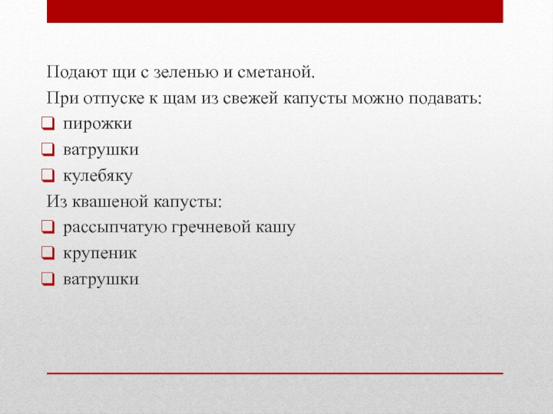 Подают щи с зеленью и сметаной.При отпуске к щам из свежей капусты можно подавать:пирожкиватрушкикулебякуИз квашеной капусты:рассыпчатую гречневой