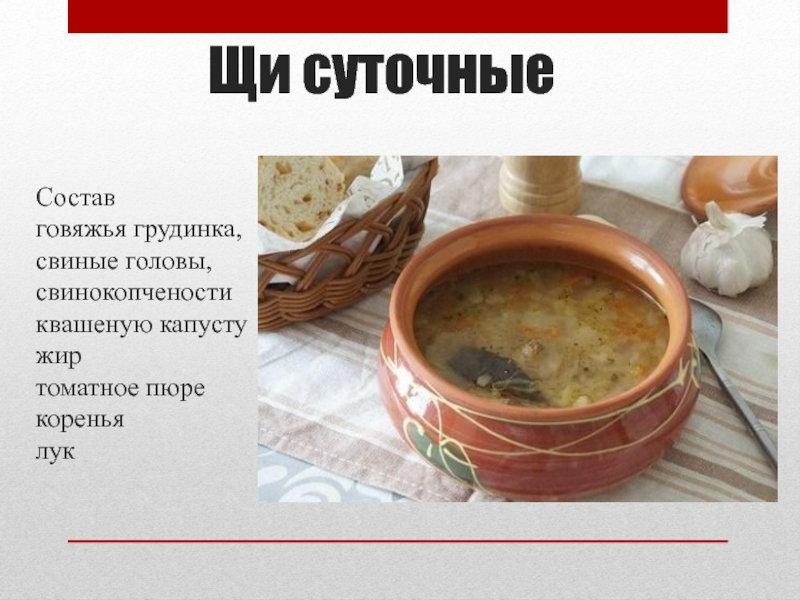 Щи суточныеСоставговяжья грудинка, свиные головы, свинокопченостиквашеную капустужиртоматное пюрекореньялук