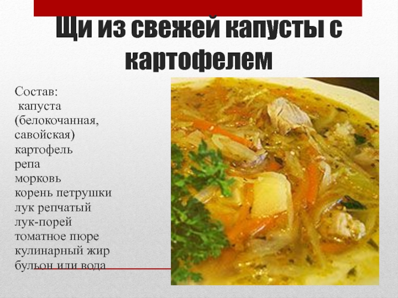 Щи из свежей капусты с картофелемСостав: капуста (белокочанная, савойская)картофельрепаморковькорень петрушкилук репчатыйлук-порей томатное пюрекулинарный жирбульон или вода