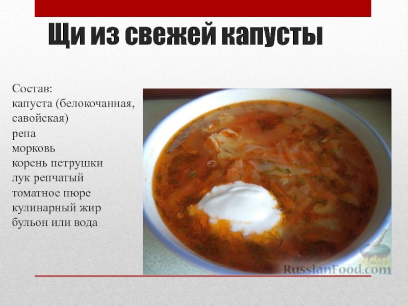 Щи – являются русским национальным блюдомГотовят щи из белокочанной свежей и квашеной капусты, савойская капуста, щавеля и