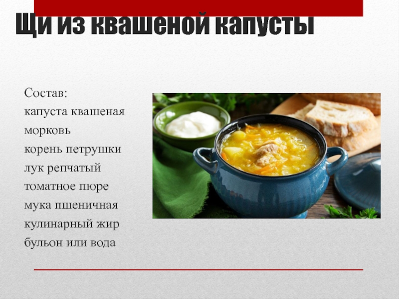 Щи из квашеной капустыСостав:капуста квашенаяморковь корень петрушки лук репчатый томатное пюремука пшеничная кулинарный жир бульон или вода