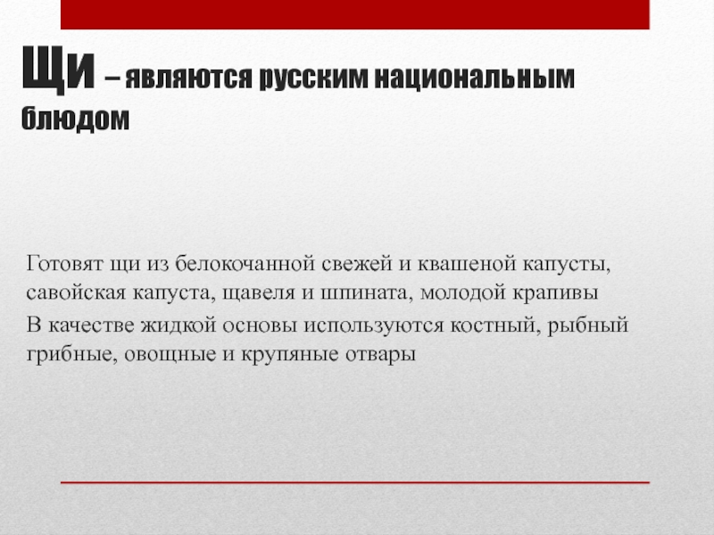 Щи – являются русским национальным блюдомГотовят щи из белокочанной свежей и квашеной капусты, савойская капуста, щавеля и шпината, молодой крапивыВ качестве жидкой основы используются костный, рыбный грибные, овощные и крупяные отвары
