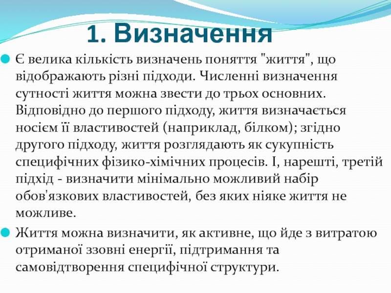 Життя можна визначити, як активне, що йде з витратою отриманої ззовні енергії, підтримання та самовідтворення специфічної структури.