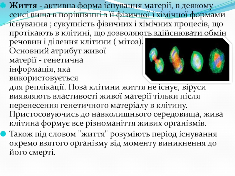 і хімічних процесів, що протікають в клітині, що дозволяють здійснювати обмін речовин і ділення клітини ( мітоз). Основний атрибут живої матерії - генетична інформація, яка використовується для реплікації. Поза клітини життя не існує, віруси виявляють властивості живої матерії тільки після перенесення генетичного матеріалу в клітину. Пристосовуючись до навколишнього середовища, жива клітина формує все різноманіття живих організмів.