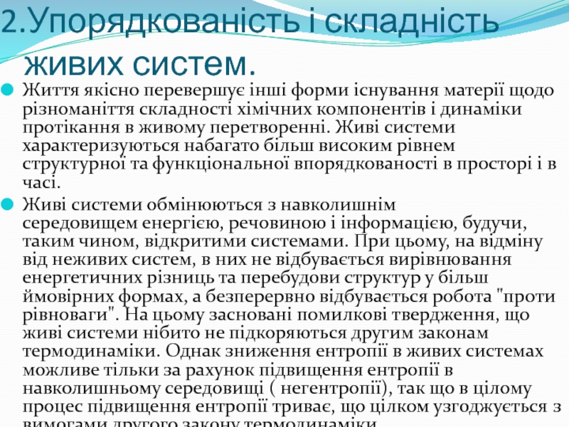 Живі системи обмінюються з навколишнім середовищем енергією, речовиною і інформацією, будучи, таким чином, відкритими системами. При цьому, на відміну від неживих систем, в них не відбувається вирівнювання енергетичних різниць та перебудови структур у більш ймовірних формах, а безперервно відбувається робота "проти рівноваги". На цьому засновані помилкові твердження, що живі системи нібито не підкоряються другим законам термодинаміки. Однак зниження ентропії в живих системах можливе тільки за рахунок підвищення ентропії в навколишньому середовищі ( негентропії), так що в цілому процес підвищення ентропії триває, що цілком узгоджується з вимогами другого закону термодинаміки.