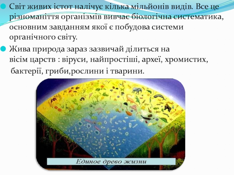 Слайд 9Світ живих істот налічує кілька мільйонів видів. Все це різноманіття організмів