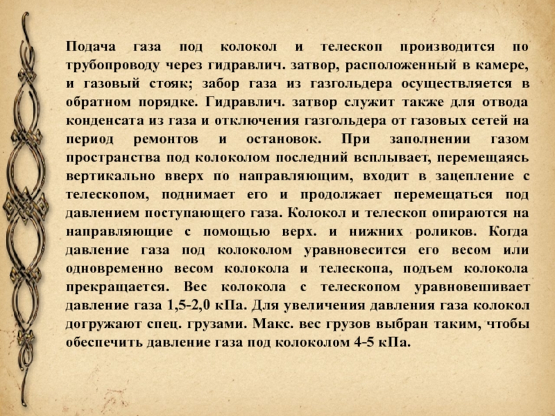 из газгольдера осуществляется в обратном порядке. Гидравлич. затвор служит также для отвода конденсата из газа и отключения газгольдера от газовых сетей на период ремонтов и остановок. При заполнении газом пространства под колоколом последний всплывает, перемещаясь вертикально вверх по направляющим, входит в зацепление с телескопом, поднимает его и продолжает перемещаться под давлением поступающего газа. Колокол и телескоп опираются на направляющие с помощью верх. и нижних роликов. Когда давление газа под колоколом уравновесится его весом или одновременно весом колокола и телескопа, подъем колокола прекращается. Вес колокола с телескопом уравновешивает давление газа 1,5-2,0 кПа. Для увеличения давления газа колокол догружают спец. грузами. Макс. вес грузов выбран таким, чтобы обеспечить давление газа под колоколом 4-5 кПа.
