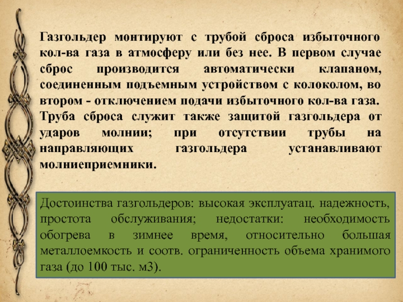 Слайд 58Газгольдер монтируют с трубой сброса избыточного кол-ва газа в атмосферу