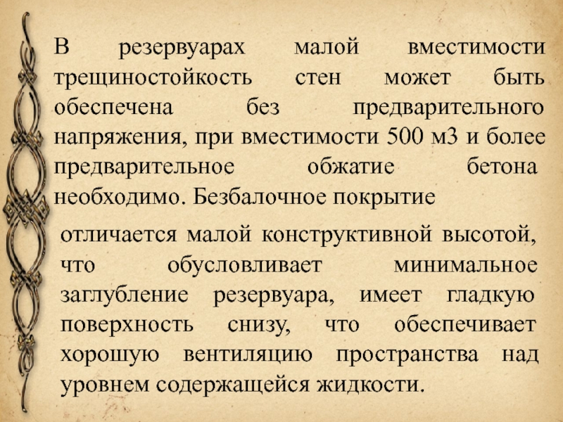 В резервуарах малой вместимости трещиностойкость стен может быть обеспечена без предварительного напряжения, при вместимости 500 м3 и более предварительное обжатие бетона необходимо. Безбалочное покрытие
