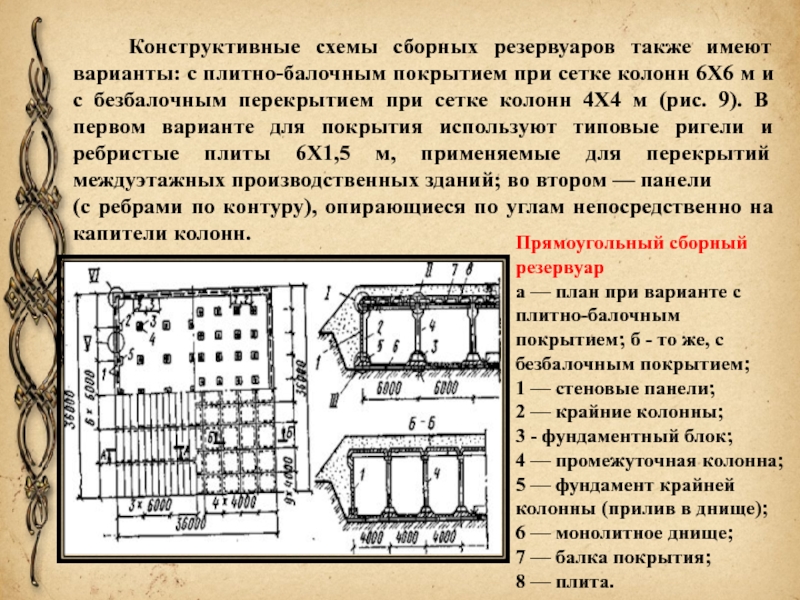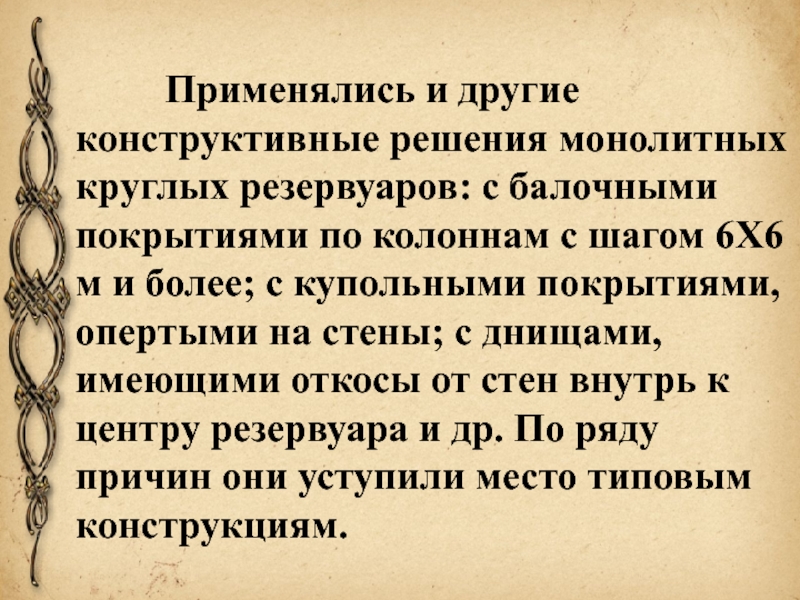 6X6 м и более; с купольными покрытиями, опертыми на стены; с днищами, имеющими откосы от стен внутрь к центру резервуара и др. По ряду причин они уступили место типовым конструкциям.