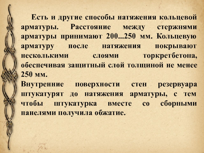 Слайд 22 В резервуарах предварительно напрягаемую горизонтальную рабочую арматуру