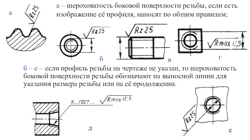 а – шероховатость боковой поверхности резьбы, если есть изображение её профиля, наносят по общим правилам;