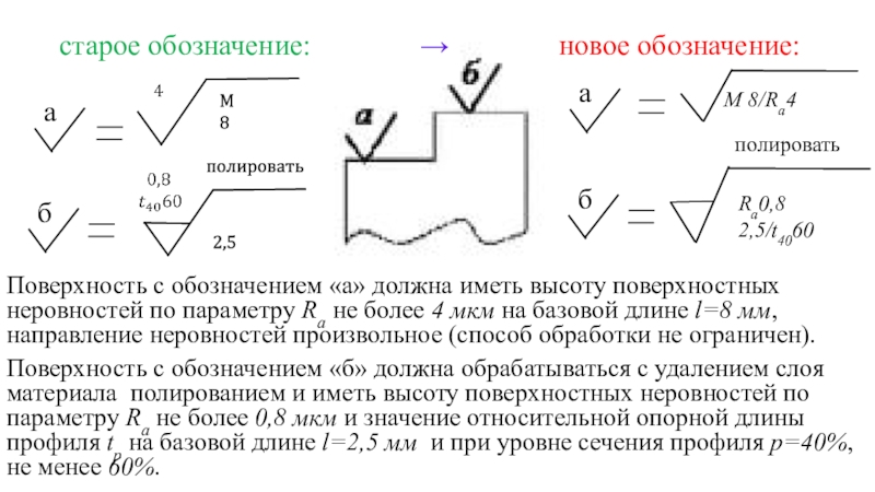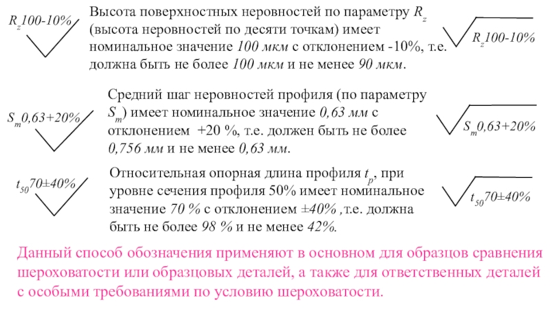Данный способ обозначения применяют в основном для образцов сравнения шероховатости или образцовых деталей, а также для ответственных деталей с особыми требованиями по условию шероховатости.
