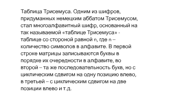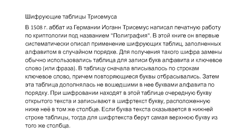 Слайд 15Таблица Трисемуса. Одним из шифров, придуманных немецким аббатом Трисемусом, стал