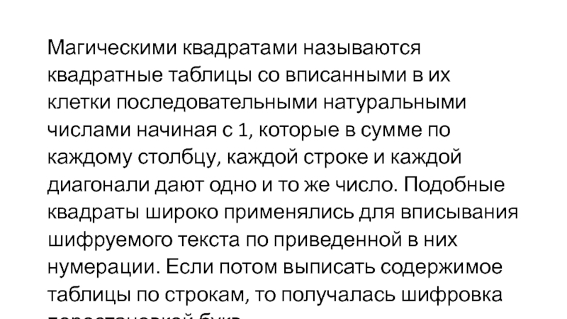 каждому столбцу, каждой строке и каждой диагонали дают одно и то же число. Подобные квадраты широко применялись для вписывания шифруемого текста по приведенной в них нумерации. Если потом выписать содержимое таблицы по строкам, то получалась шифровка перестановкой букв