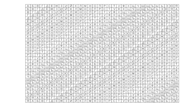со стороной равной n, где n – количество символов в алфавите. В первой строке матрицы записываются буквы в порядке их очередности в алфавите, во второй – та же последовательность букв, но с циклическим сдвигом на одну позицию влево, в третьей – с циклическим сдвигом на две позиции влево и т.д.