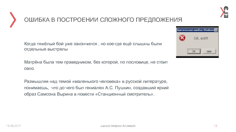 Слайд 15ОШИБКА В ПОСТРОЕНИИ СЛОЖНОГО ПРЕДЛОЖЕНИЯ