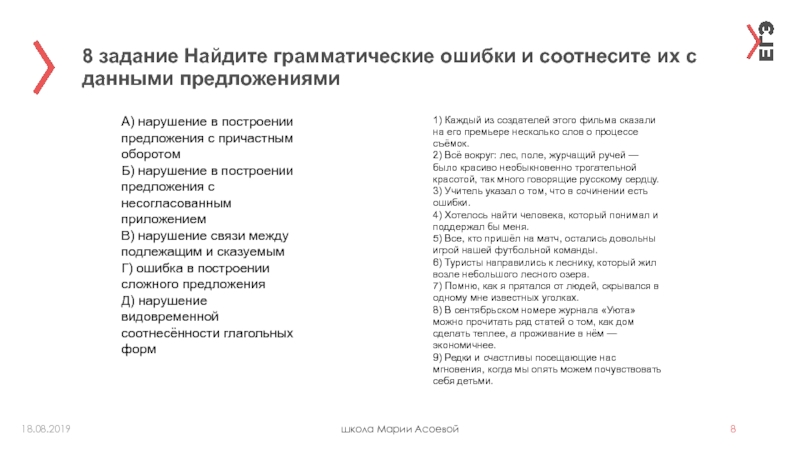 Слайд 98 задание Найдите грамматические ошибки и соотнесите их с данными