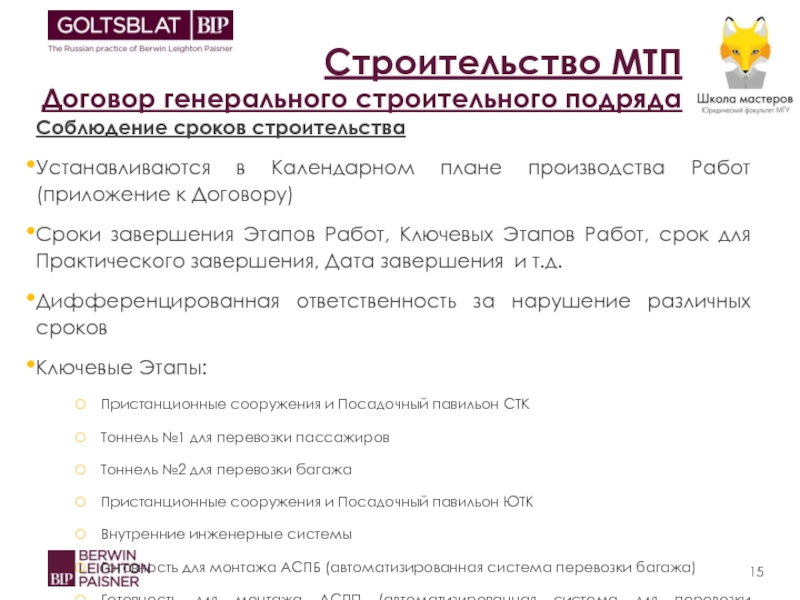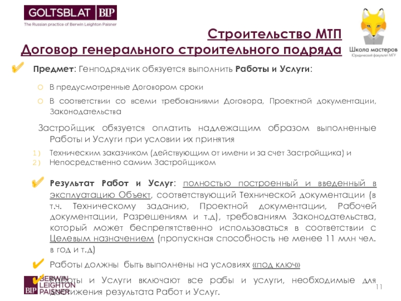 Цель Договора: планирование, организация, координация и контроль за осуществлением Работ Ген. проектировщиком, Ген. подрядчиком, всеми иными подрядчиками и субподрядчиками, задействованными в реализации Проекта, для завершения строительства Объекта и получения ЗОС в отношении Объекта в соответствии с: