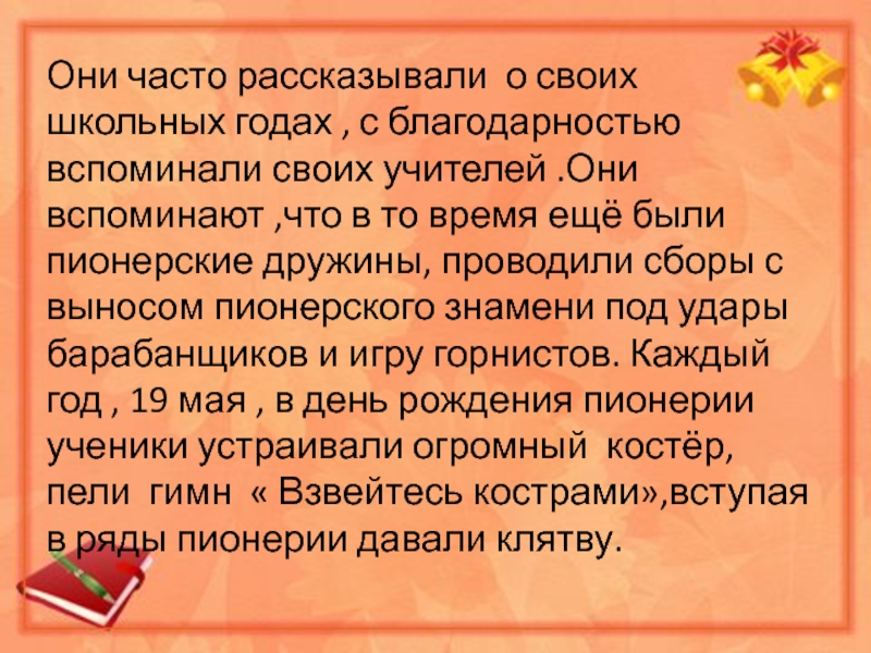 Они часто рассказывали о своих школьных годах , с благодарностью вспоминали своих учителей .Они вспоминают ,что в то время ещё были пионерские дружины, проводили сборы с выносом пионерского знамени под удары барабанщиков и игру горнистов. Каждый год , 19 мая , в день рождения пионерии ученики устраивали огромный костёр, пели гимн « Взвейтесь кострами»,вступая в ряды пионерии давали клятву.