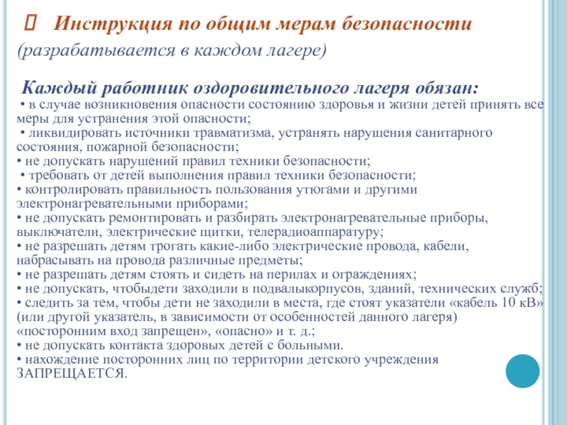 • следить за тем, чтобы дети не заходили в места, где стоят указатели «кабель 10 кВ» (или другой указатель, в зависимости от особенностей данного лагеря) «посторонним вход запрещен», «опасно» и т. д.;