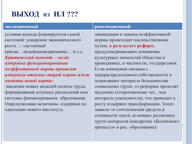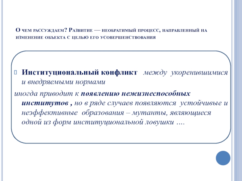 иногда приводит к появлению нежизнеспособных институтов , но в ряде случаев появляются устойчивые и неэффективные образования – мутанты, являющиеся одной из форм институциональной ловушки ….