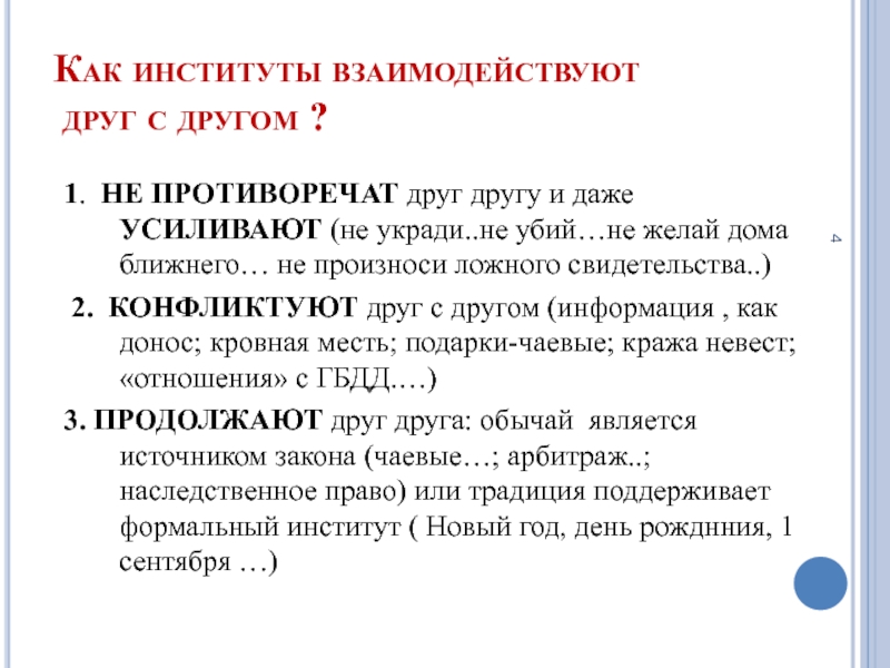 3. ПРОДОЛЖАЮТ друг друга: обычай является источником закона (чаевые…; арбитраж..; наследственное право) или традиция поддерживает формальный институт ( Новый год, день рожднния, 1 сентября …)