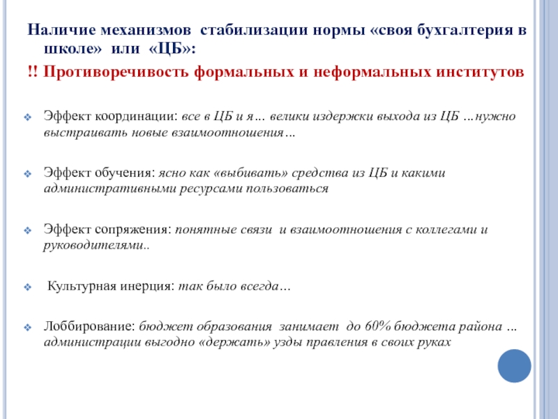 Слайд 22Наличие механизмов стабилизации нормы «своя бухгалтерия в школе» или «ЦБ»: