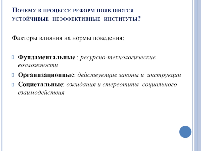 Слайд 17Почему в процессе реформ появляются устойчивые неэффективные институты?
