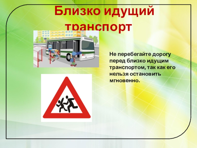 Не перебегайте дорогу перед близко идущим транспортом, так