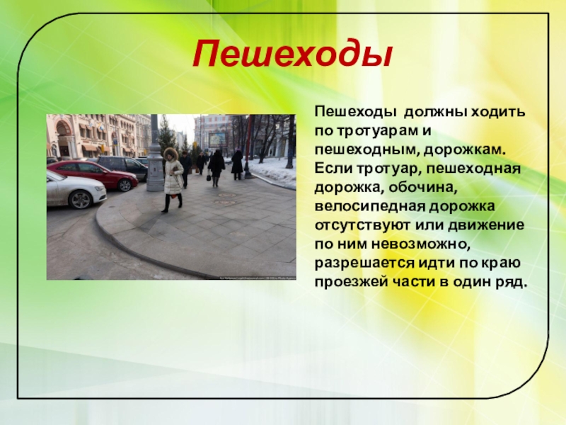 пешеходным, дорожкам. Если тротуар, пешеходная дорожка, обочина, велосипедная дорожка отсутствуют