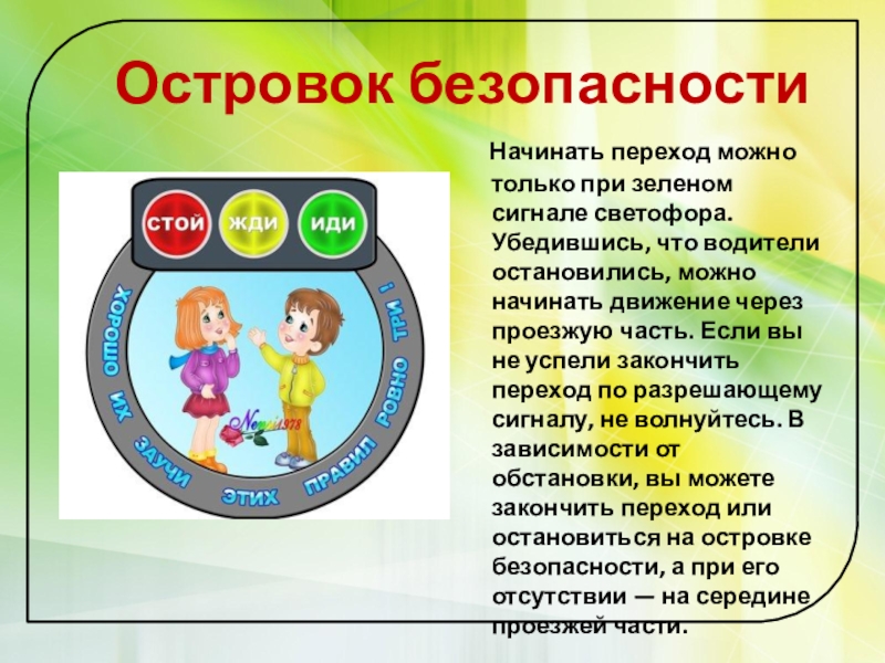 через проезжую часть. Если вы не успели закончить переход по разрешающему сигналу, не волнуйтесь. В зависимости от обстановки, вы можете закончить переход или остановиться на островке безопасности, а при его отсутствии — на середине проезжей части.