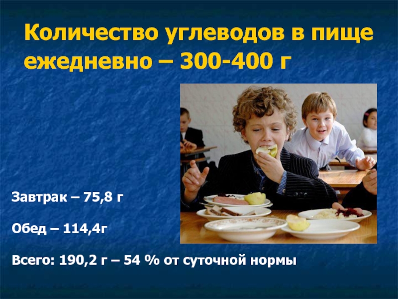 Количество углеводов в пище ежедневно – 300-400 г Завтрак – 75,8 гОбед – 114,4гВсего: 190,2 г –
