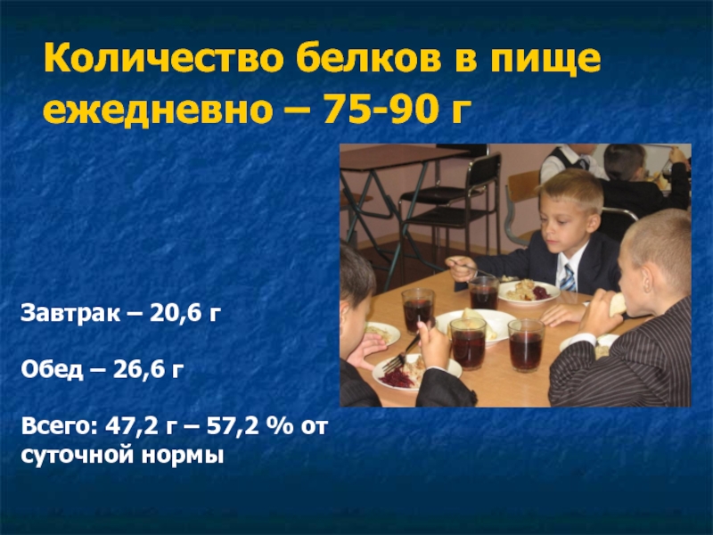 Количество белков в пище ежедневно – 75-90 г Завтрак – 20,6 гОбед – 26,6 гВсего: 47,2 г