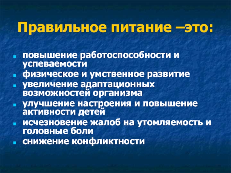 Правильное питание –это:повышение работоспособности и успеваемости физическое и умственное развитиеувеличение адаптационных возможностей организмаулучшение настроения и повышение активности