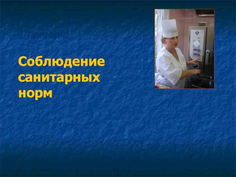 2 принцип  РазнообразиеМеню свободного выбора:Количество салатов – 4-5 наименованийКоличество супов – 1-2 наименованийКоличество мясных блюд –