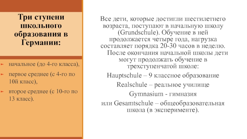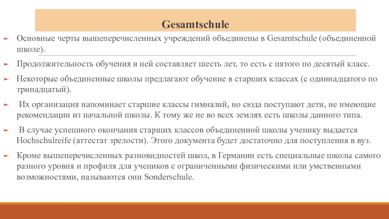 Основные черты вышеперечисленных учреждений объединены в Gesamtschule (объединенной школе).