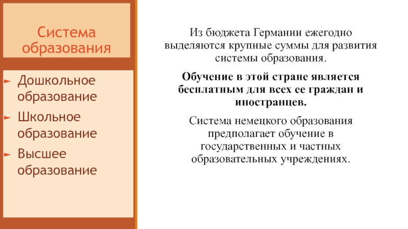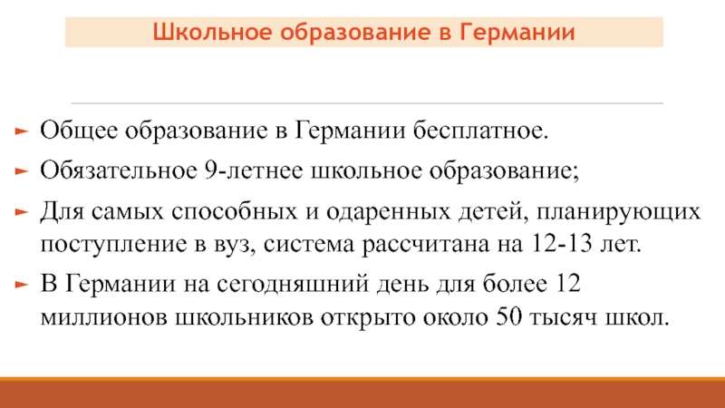 Система немецкого образования предполагает обучение в государственных и частных образовательных учреждениях.