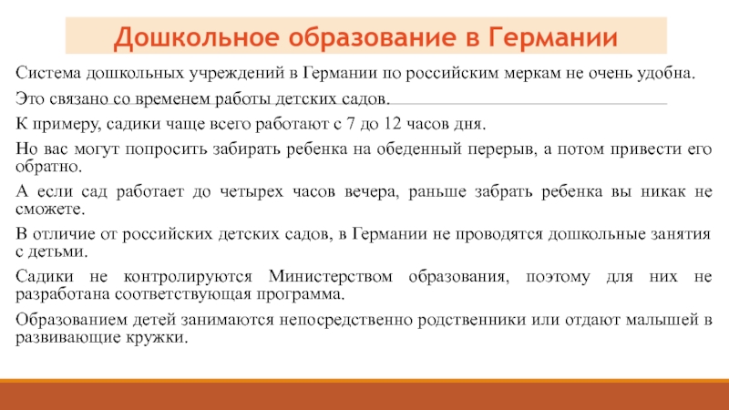 В отличие от российских детских садов, в Германии не проводятся дошкольные занятия с детьми.